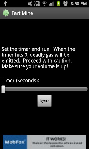 A timed and deadly fart mine for your phone! Get ready for an epic explosion. Just set the timer on the fart mine, strategically place your phone near an unsuspecting victim, and head for the hills! The age old prank, Fart Mine brings the classic whoopee cushion into the 21st century. It’s modern prank warfare at it’s deadliest. Go ahead and download Fart Mine today!